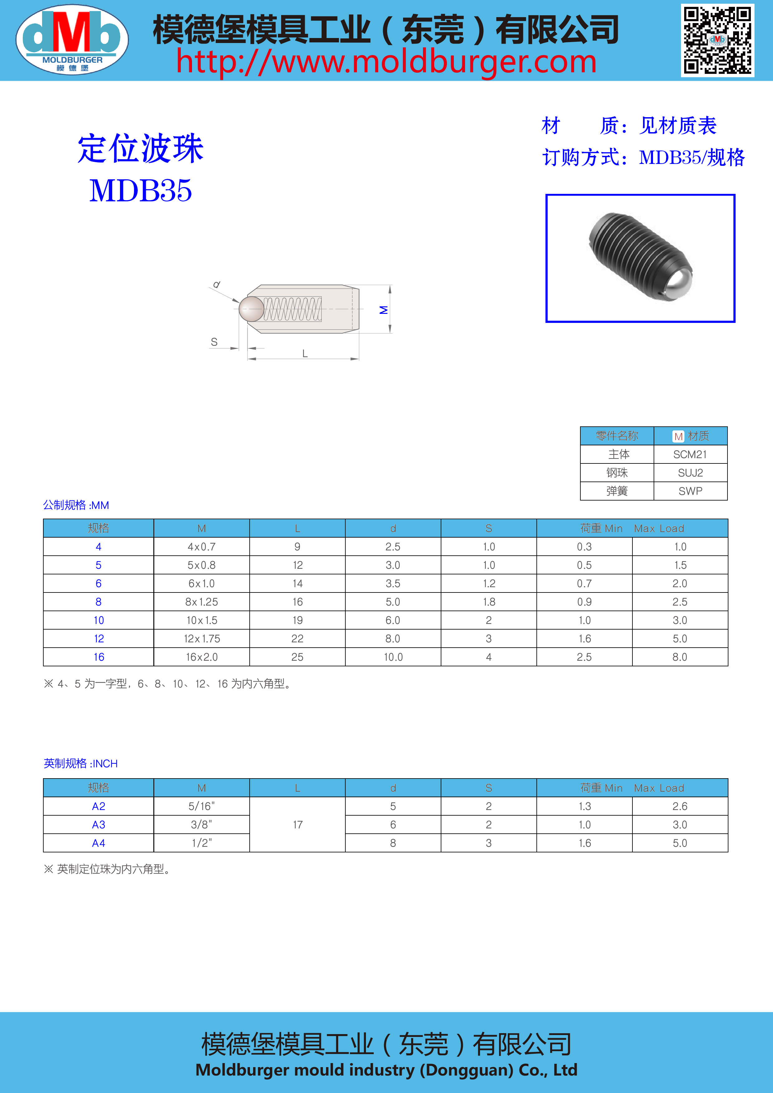 MDB35 定位波珠 球头柱塞 波珠螺丝 定位 弹簧柱塞 定...